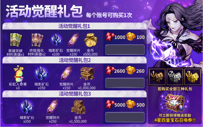 商城礼包新增活动觉醒礼包,每种礼包每个账号可购买1次。