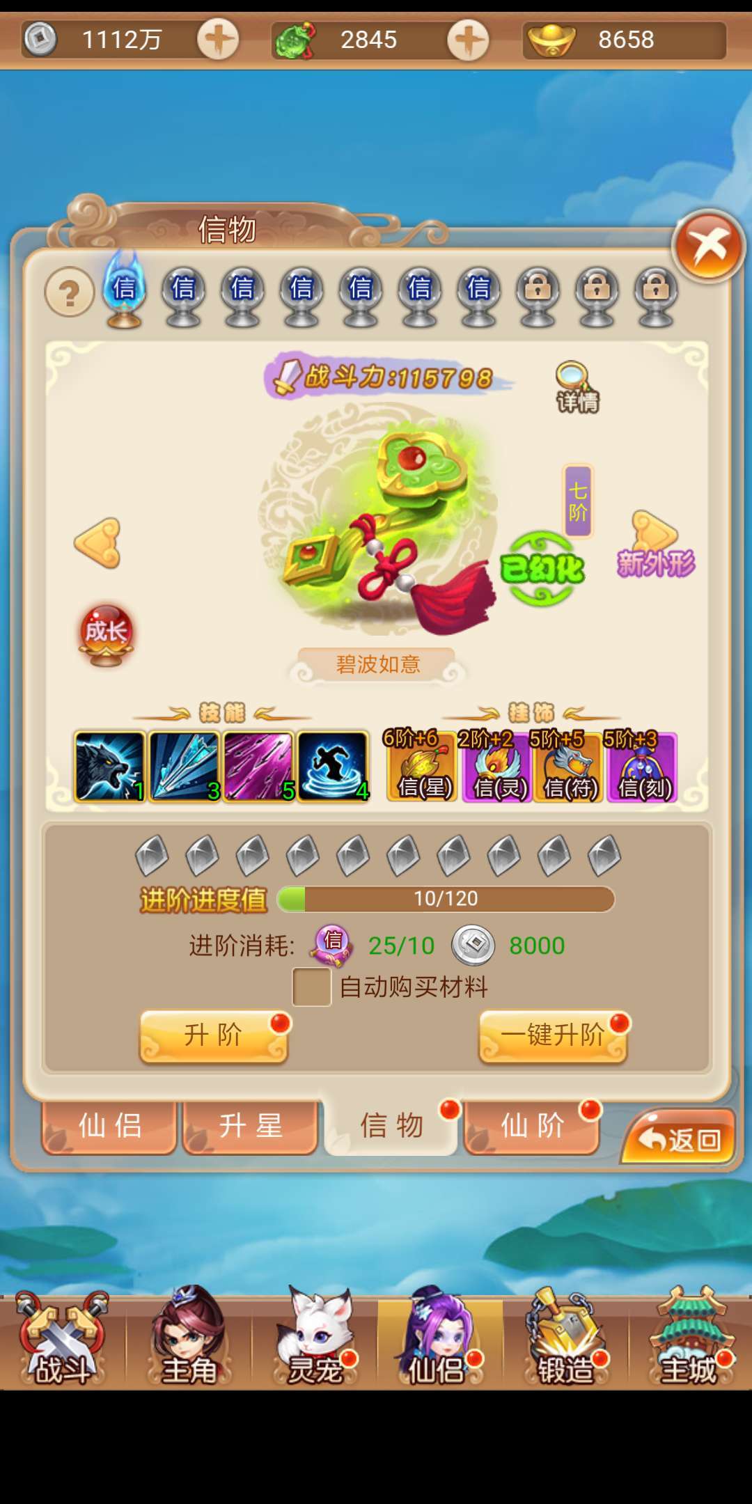 仙阶:仙阶的养成方式与信物类似,通过消耗“仙阶进阶丹”进行升阶,通过技能书和装备强化,通过成长丹提升数值。