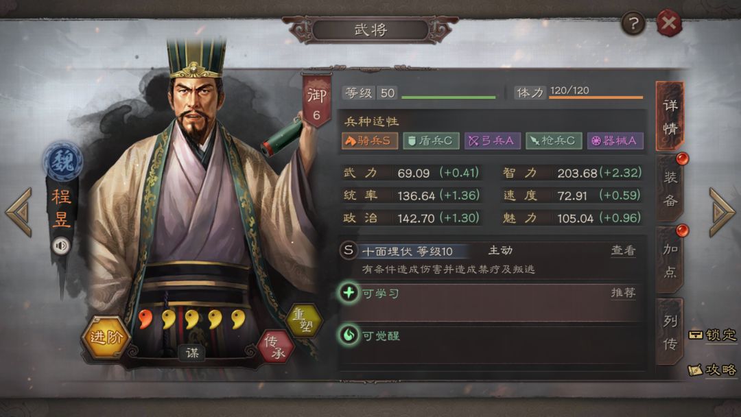 游戏中的程昱,优秀兵种适性有骑兵S、弓兵A和器械A。智力属性优秀。