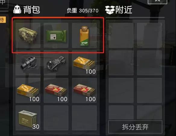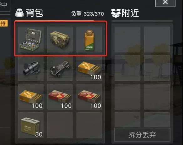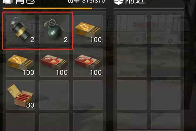 投掷武器方面,大家可以携带2个手榴弹和2个烟雾弹,一共是52的容量。大家一定不要忽视投掷武器的存在,像利用手雷声东击西,利用烟雾弹掩护扶队友等等都是很好的战斗技巧~但由于投掷武器的容量占比较大,小背包建议大家不用带多,并且这类物品比较常见,大家在消耗后也可以及时补充。