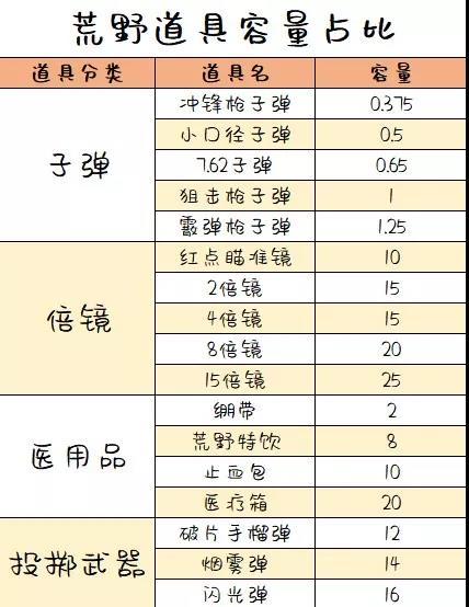 小背包给大家带了一点见面礼~这是我统计的一些荒野道具的基本容量占比。