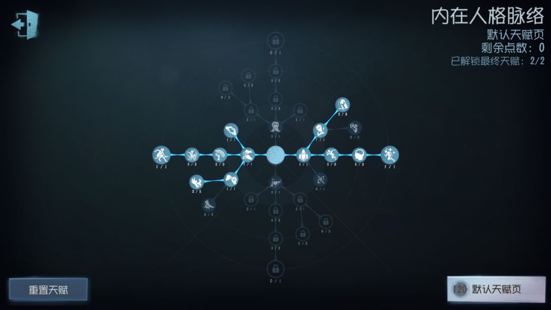 这是一套通用的牵制型角色人格加点方式,绝处逢生(自愈)和回光返照(大心脏)为必点天赋,杂技演员作为牵制位基本无需救人,所以双弹射转点由为重要,破窗理论必点,求生意志可以避免屠夫将你强行牵到遗产机附近守电机,尤其配合冷却弹有时会有意想不到的效果,如果挣扎下来对屠夫而言节奏就会全部被打乱,假寐可以降低起飞速度,给修机位更多时间破译电机,给救援位更多时间博弈。