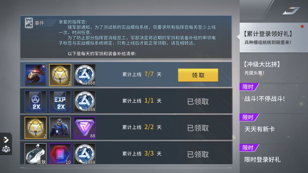 1.新手七天登录,目前我登录了七天,获得了合金*7520、卡牌战地技师和突袭者,以及一些礼包合金卡啥的。如图,只玩了七天