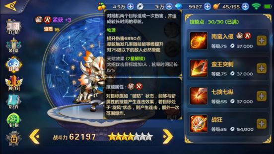 1技能大招南蛮入侵,发射两枚火球(7星能发射三枚),眩晕且伤害不俗,配合水镜可产生爆炸,因为孟获有火属性,所以和风系配合完美。