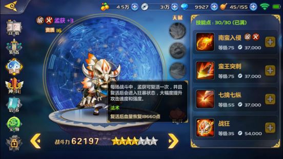 3技能:复活,没说的,强!我孟获现在75级,起身有18000多血,孟获复活需要时间,往往是敌人前排过去出后,孟获起身了,不要太爽。