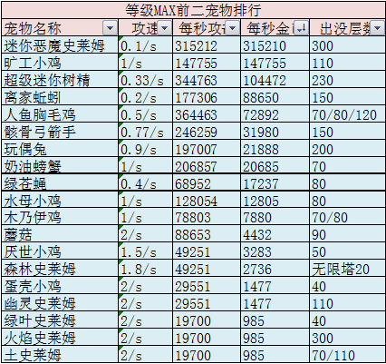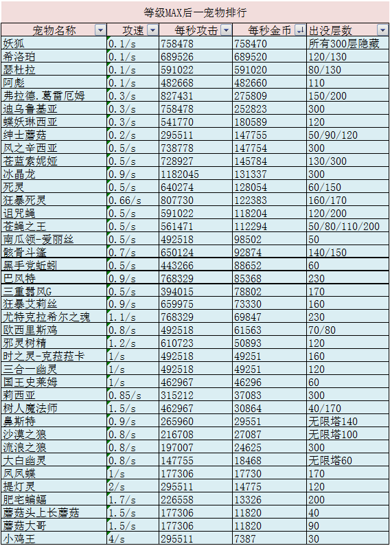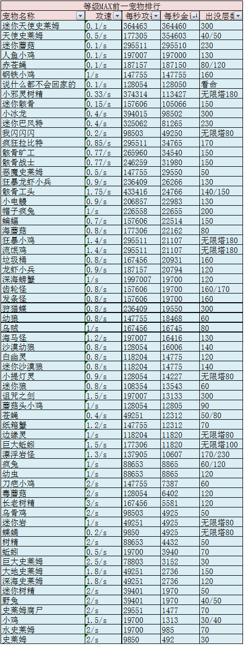 本帖列出了宠物所属位置,攻击频率,攻击力,金钱获取能力,以及简易的掉落层数(也可用作刷卡片的参考)。后期转生多了,点击金币获取量多了可以通过看广告刷新商店买顶级卡片。