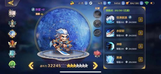 2、紫霞:16资质的神将,能打能抗,我用来当做福坦了,队伍的最高输出,经常一个大招干死对面前排(紫霞开大的时候对面前排基本半血左右),一定要有水属性,不然打人不疼。紫霞二技能是核心技能,控制对面智力武将,一般智力武将都是输出和奶,基本第一个控制完可以连上第二个,好几秒不能动,很好的控制对面输出。三技能紫霞的神技,时间越长攻击越高,观察了好几次,孙坚打对面700血的时间,紫霞一个平A要在2100左右了,非常强劲。紫霞4技能比较平常和孙坚一样加物理防御,增加生存时间,打出更高输出。