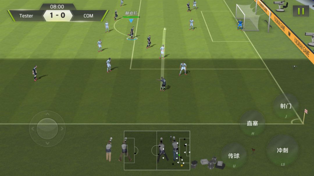 2. 射门是个技术活,当我们边锋把球递给中锋的时候就要看我们中锋表演了,在屏幕右下方有个射门按钮,按住射门按钮会在按钮上方出现一个小球门,这个时候需要观察对方门将站位,选择合适的拖动位置,把球稳稳射进。