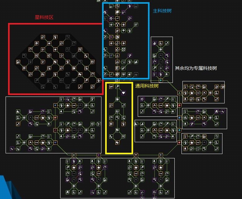 科技树总共可以划分四个分支,主线科技树,通用科技树,星科技树以及专属科技树。