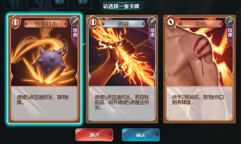 如果在结算时没有自己觉得理想的卡牌我们可以选择放弃这一项奖励以免牌库中拥有过多的无用卡牌影响单个回合我们抽到有用卡牌的几率。