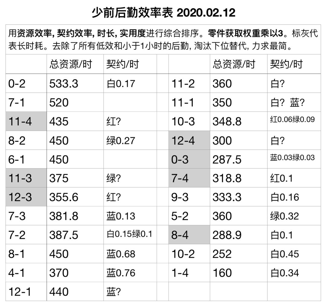 少前后勤效率表