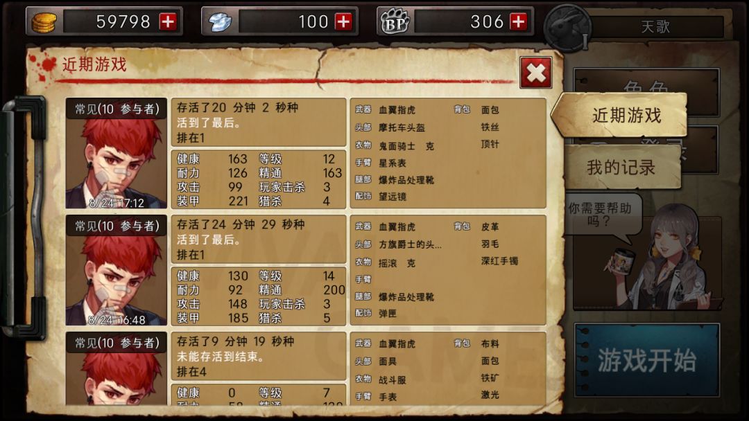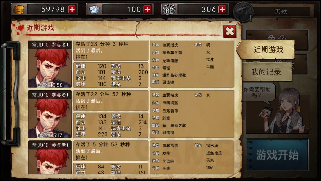 之后一路把齿虎升到紫,其他装备能装备上就装上,待到武器成型。就寻找其他装备的一一升级。待到剩下五个人左右,就可以和他们试着打打,能打就打,不能打就跑。