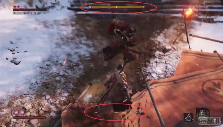 重头戏当然还是在战斗系统上,《只狼》摒弃了黑魂那种“你一刀我一刀”的回合制攻防玩法,而是采用了“刀刀到肉”这种更写实,也更刺激的战斗方式:敌我双方先是刀剑互击,每次攻击后都会累积一定的“站姿槽”,站姿槽满后角色会失衡,出现一个巨大的破绽。