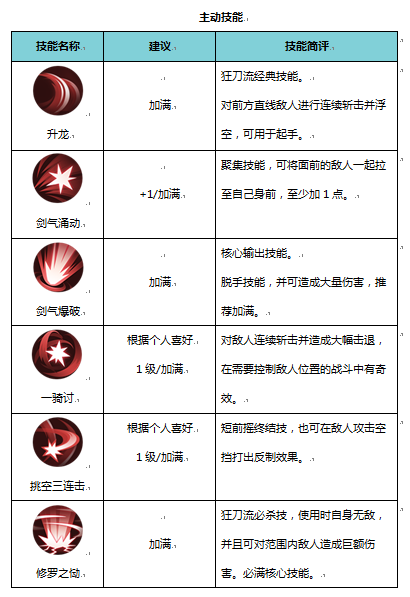 之后,是转职后走上了杀马特道路的狂刀篇(小哥,你离杀马特就差一个纹身了,真的!!)。如果说居合流是自己开心的跳来跳去,狂刀就是强硬的逼着别人跳来跳去了。升级之后的一骑讨,可以推着敌人飞向地图彼岸,而面对想逃走的敌人,剑气涌动则可以让敌人绝望的飞回使用者身边。这类强迫敌人位移的技能在团战中可以对己方脆皮进行有效保护,也可以将对方脆皮推至我方火力区,具体怎么秀,请大家开始自己的表演吧!除了位移类技能,狂刀还拥有两个脱手输出技能——剑气爆破和升级版的裂地猛击。这两个技能范围大,伤害高,还没有后摇困扰,实乃居家旅行必备良品,推荐大家一定要加满。不过,狂刀虽然技能效果强,伤害高,但整体速度低,攻击时自身也有很大破绽,这点在玩狂刀前需要有心理准备。