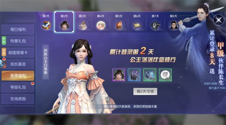 登录奖励也是在福利按钮中查看,点击登录福利我们可以看到累计登录的每日奖励内容,从第一天到第八天我们可以领取多种不同的丰厚奖励,第一天包括金币、黑曜石、强化石和银币,第二天包括伙伴白落衡、黑曜石、强化石和银币,第三天会有荒火灵狐坐骑奖励,第四天会有橙色灵石奖励,后面分别会得到神器道具地火之晶、高级暴伤技能书和时装卡以及甲级伙伴陈长生等超值奖励,大家一定不要错过。