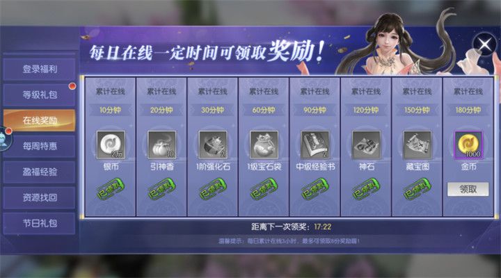 当道友们进入游戏中开始游戏历程后便会累计登录时间,我们在游戏中呆得越久累计的游戏时间也就越久,这些游戏时间当然不是无用的,它可以帮助我们获得游戏内的在线奖励。点击游戏界面上方的福利按钮我们可以进入日常福利界面,累计在线10分钟、20分钟一直到180分钟会有多种不同的在线时间奖励,我们可以通过在线奖励获得丰厚的回报:银币、引神香、强化石、宝石袋、经验书、神石以及藏宝图和金币等等,这些奖励需要大家及时领取,这样就可以在30分钟后领取下一阶段的奖励了。