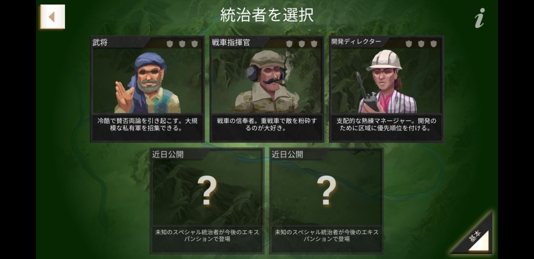 将军:开局即可获得一个堡垒,并具备开局即可训练军队的能力,将军手下的国民军战力要更高一些,面对后期穷凶极恶的叛军时效果非常显著,缺陷是发展民生的费用较比其他决策者要提高许多。