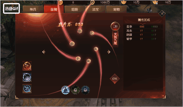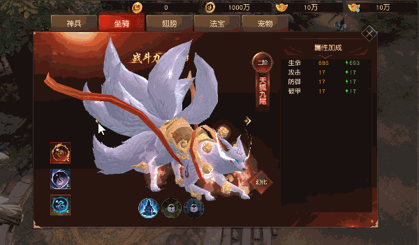 同时给龙马喂食坐骑进阶丹可以使其进阶哦,幻化为实力更为强劲的--“九尾天狐”