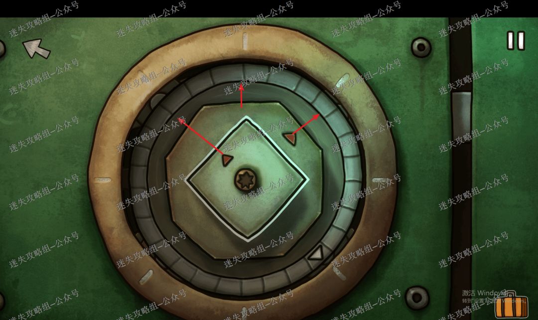 我们进入水池这里看到有两个坏人在水池边上洗,在他们的上方有一个纹身店铺,我们只需要把每个开关转一下,找到每个对应的位置再转动,先转中,再转小,最后转大,转到如图箭头位置就可以打开门了。