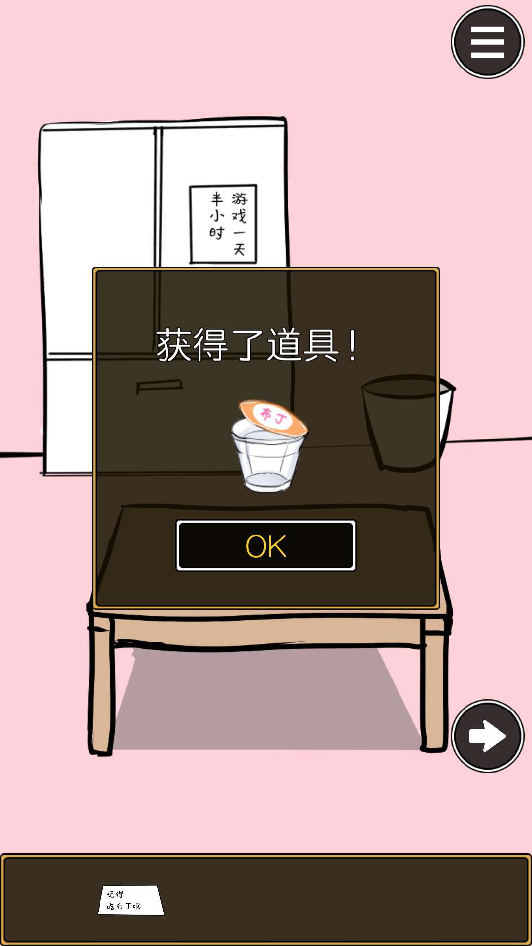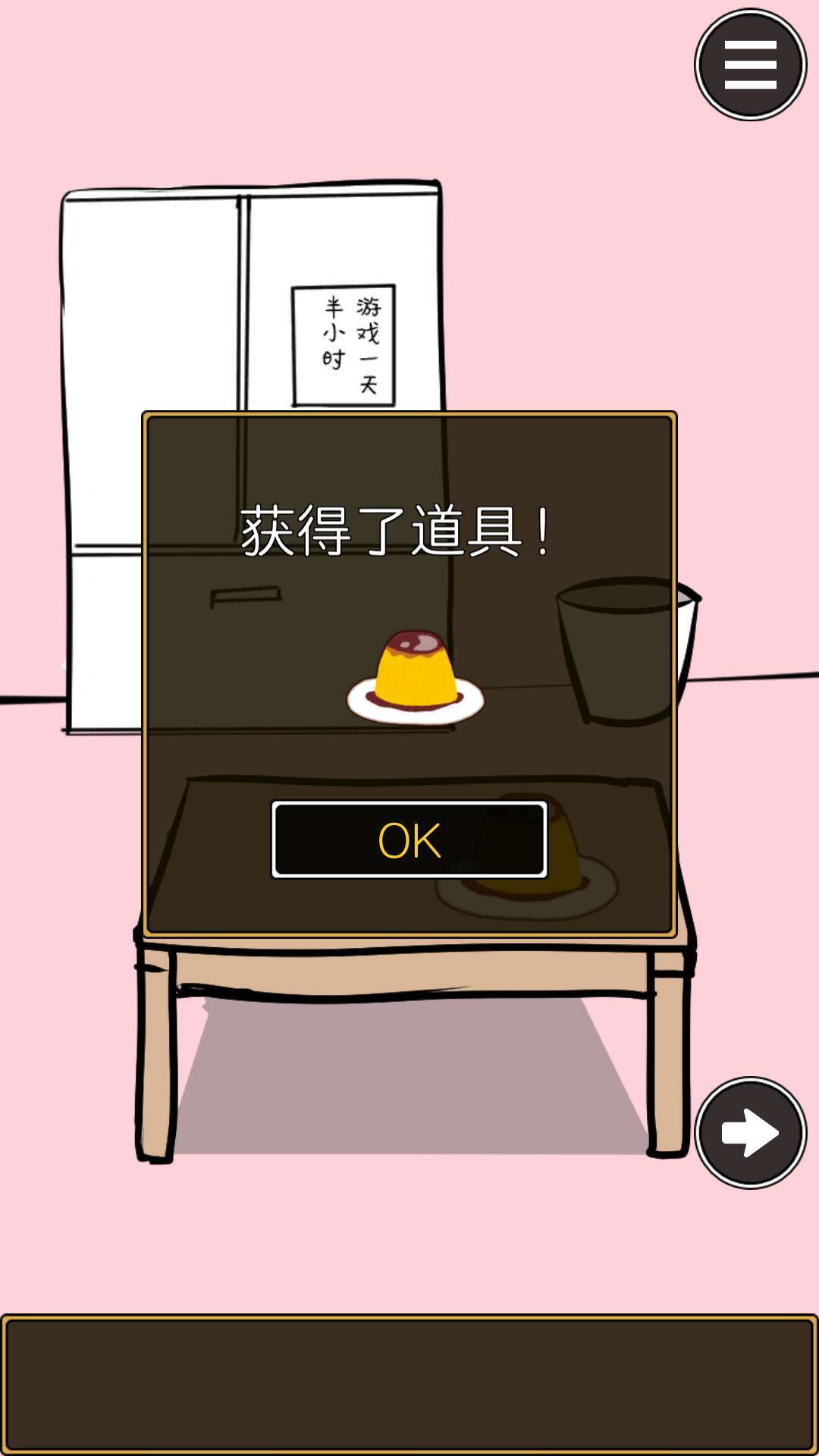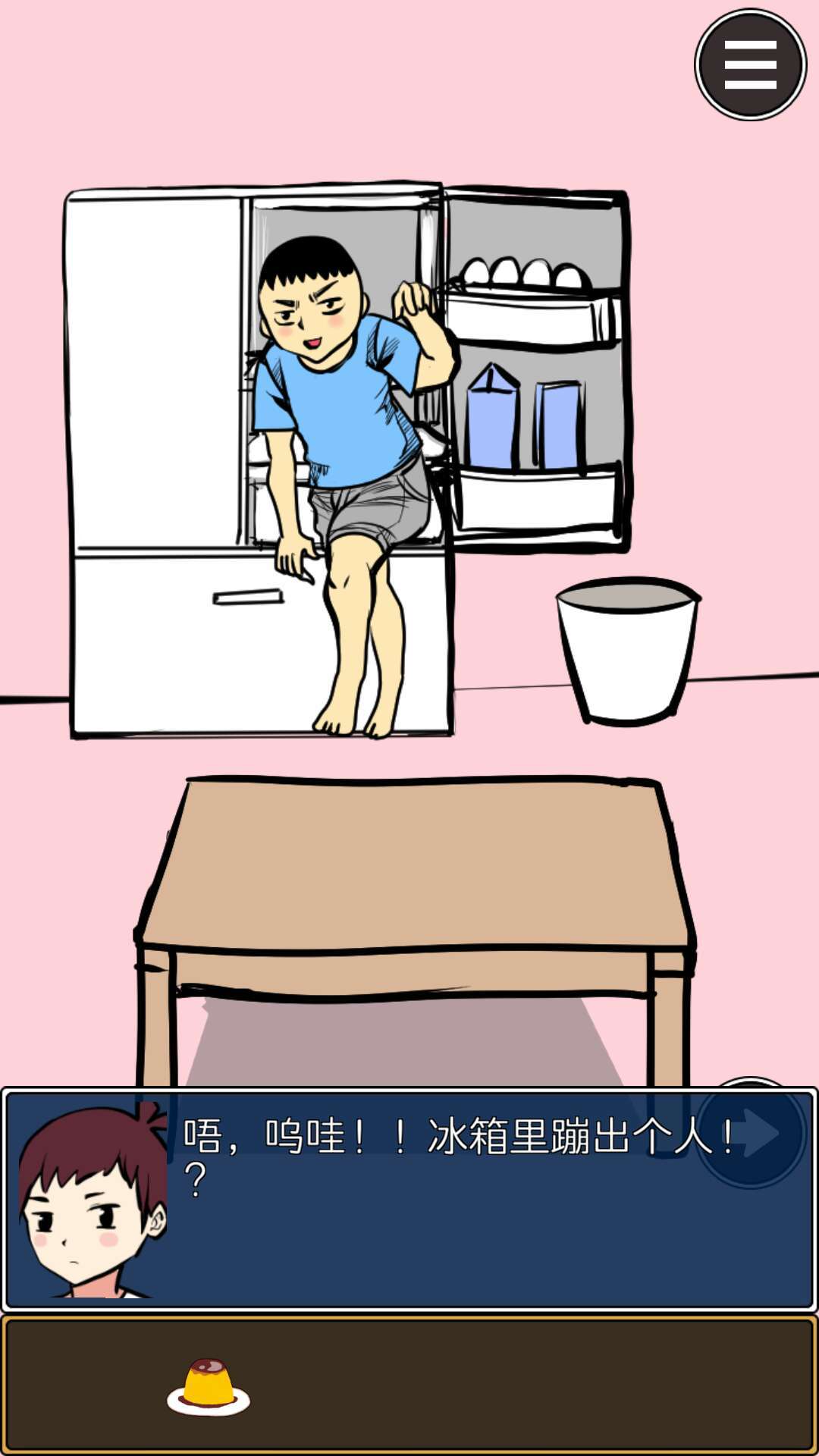 本关是游戏机被藏起来了!点击桌子上的布丁,得到布丁