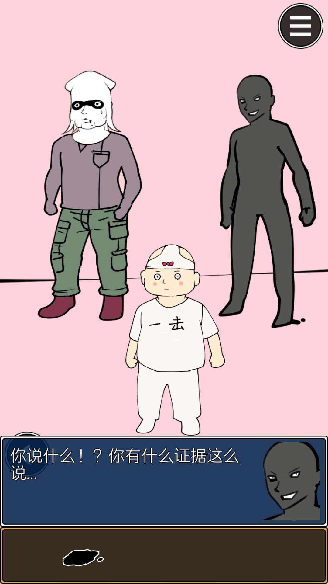 来到第二页,先不用墨迹,先和每个人对话。对完话之后,将墨迹拖到黑衣人身上使用,辨认出真凶,过关: