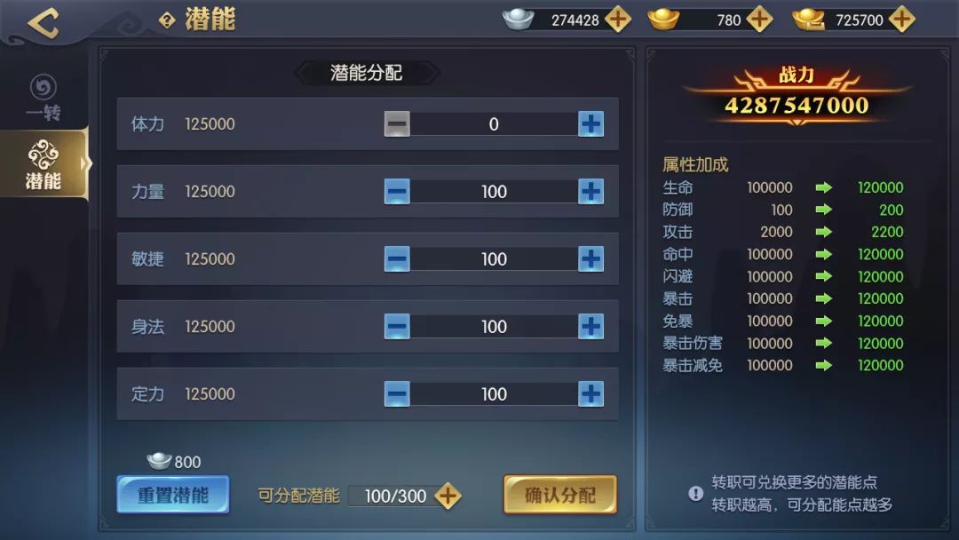 5. 转职后玩家可消耗银两和经验兑换更多的潜能点