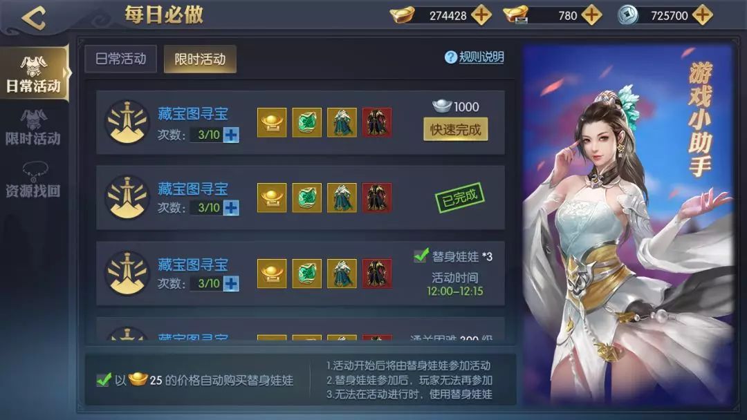 3、限时活动助手:可在活动开始前使用替身娃娃,使用后将替代侠士参与活动,在活动期间,侠士无法再参加或取消替身娃娃。目前仅开放御前殿试活动,后续会逐步开放其他活动