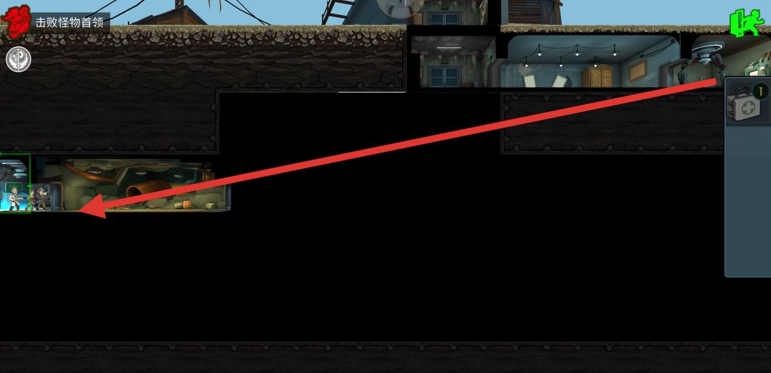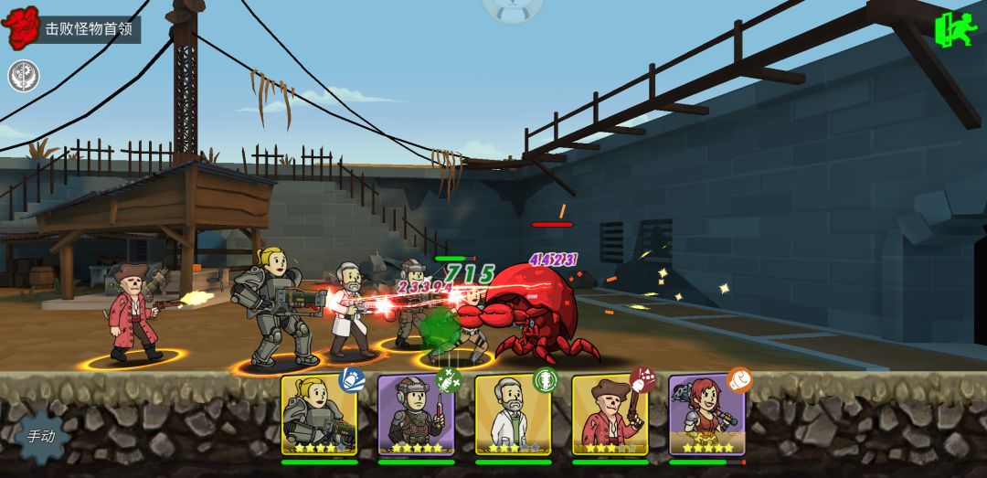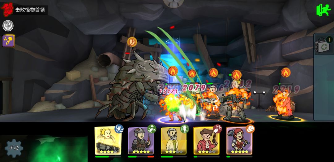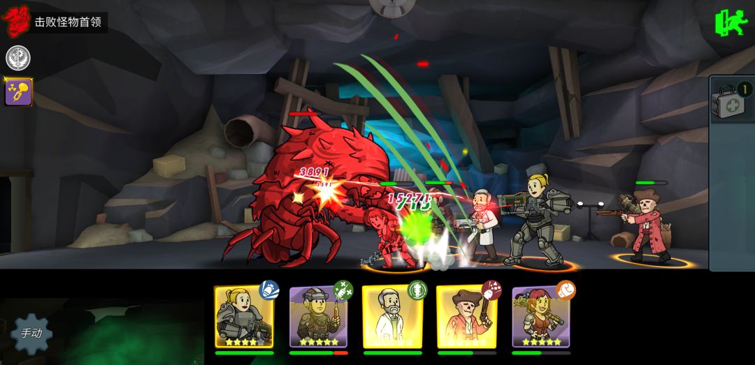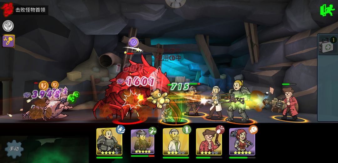 往右走直接是一只辐射螃蟹,伤害较高,因为是我跨战力的原因,一下打我凯特2w3千多。建议凯特血量不低于8w。必须带生存,以便给给医生充足的时间来奶回来。