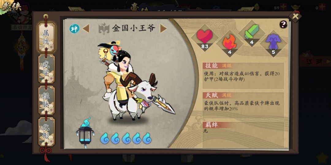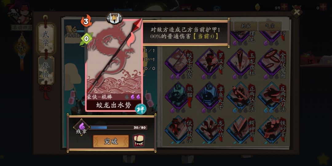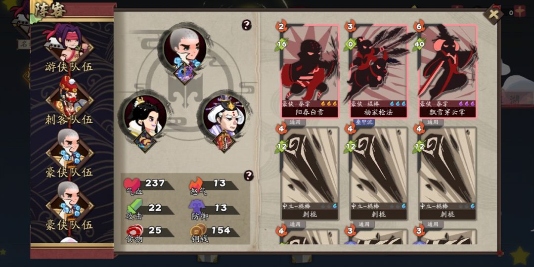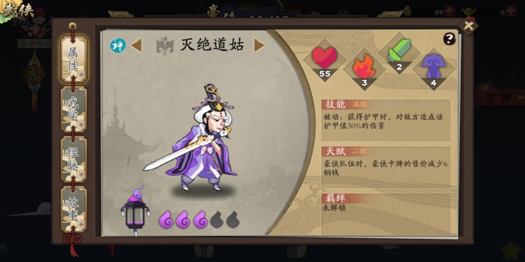 这三个基本上是都要拿的猴棍记得好像是成就那获得的这是叠甲流核心不用解释了吧其他两个有刷出的话尽量突破高级点,伏魔功不算特别需要。武侠搭配解析宫主:不用解释了优质豪侠卡,阳春白雪推荐第一优先升级双冷血加强豪侠的高攻击牌基本上前期压力不大就算牌运差也能直接敲死小怪,不过高怒气消耗还是对经脉要求有点的。道姑:获得护甲时能对对方造成伤害,叠甲叠起来后甚至靠被动都能直接秒了怪了用了就知道有多爽了而且给的武侠卡还是优质高伤过牌挺舒服的前期配合阳春白雪伤害没的说