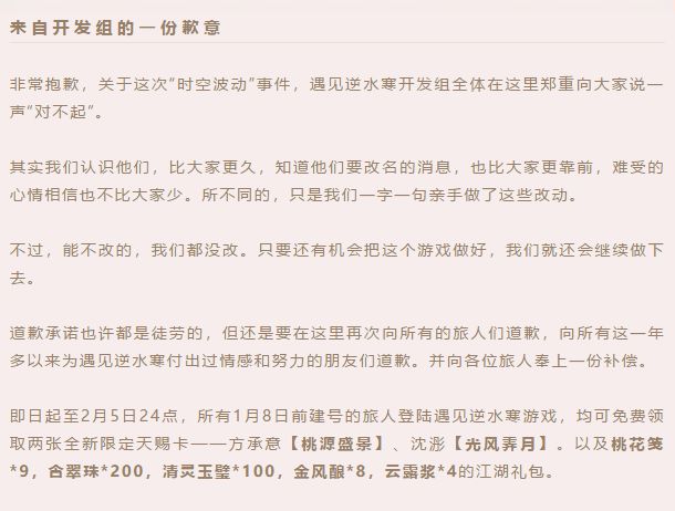 为了表达因为时空混乱给对各位旅人带来不便的歉意,1月9日更新后至2月5日24点,所有1月8日12点前建号的旅人登陆遇见逆水寒游戏,均可免费领取两张全新限定天赐卡——方承意【桃源盛景】、沈浵【光风霁月】,祝大家游戏愉快。(这两张限定天赐卡后续也会增加新的获取方式,新玩家也有机会获得,无须担心)