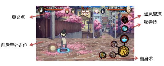 相较于拳皇、街霸等传统FTG,火影手游的决斗场虽然弱化了择和搓招等复杂的操作,但在立回上做了很多设计。比如三维的决斗场,通过上下左右(甚至天上)的走位,形成对自己有利的局势;比如秘卷的攻击与防御设计,进攻方需要走位和判断提高秘卷的命中率,防御方需要走位躲过秘卷攻击范围;这些都与立回息息相关。