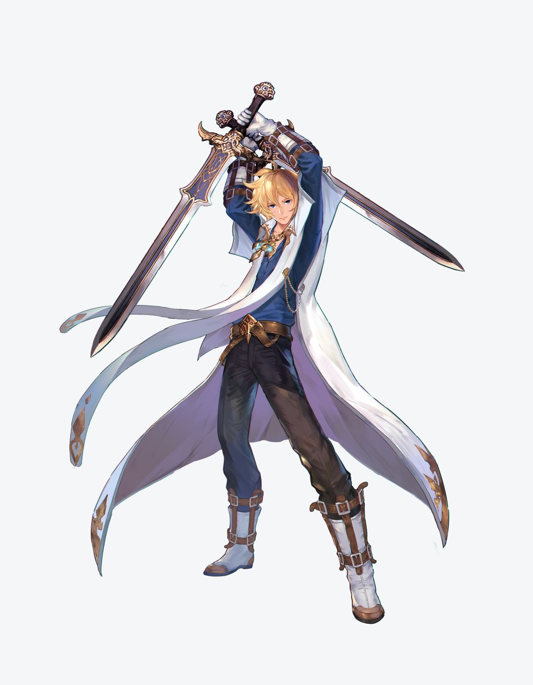 因此我们采用了金色发式+骑士装+披风的形象,另外使用了白+蓝的经典英雄配色。同时,我们将其设定为一个天才的骑士团剑士,因此他使用双剑作战。