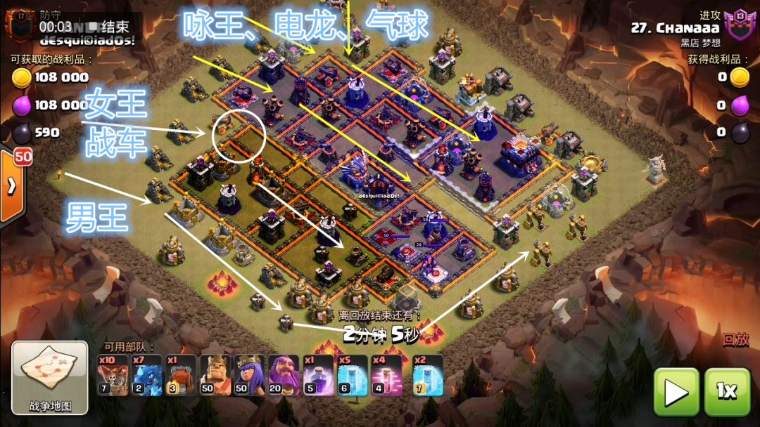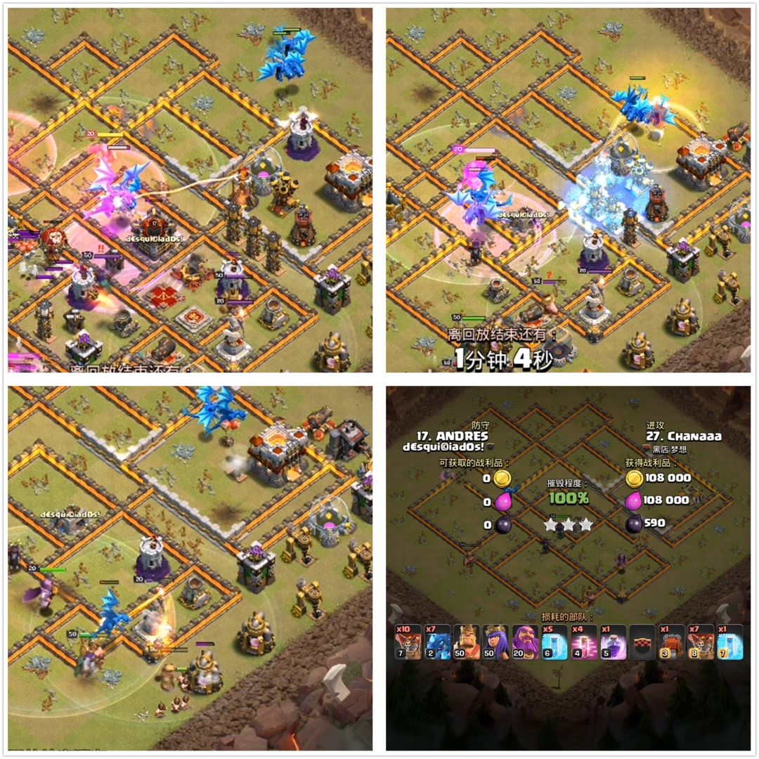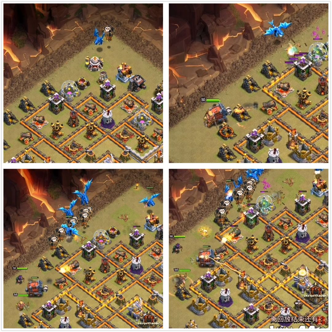 先来说失误,原本的设计是战车开墙之后让女王往内圈走,男王走外圈,男王吸引火力,女王舒舒服服地打输出。但是,从最开始下男王的时候就比较偏里,可以看上面那张图,如果男王再往下放一点,女王会直接跟着战车走进内圈了。不过这也没关系,只是走外围,内圈会残留一些建筑。电龙这边没有跑偏,直接在内圈狂轰乱炸可以说威力十足。