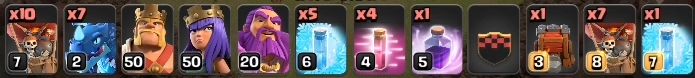 7电龙17球标配,这里自带的气球也可以少2个改成苍蝇,毕竟电龙非常容易一星或者两星摧毁率99%,这样就很尴尬了。不过如果对自己有信心的话,2个气球的作用肯定要比5只苍蝇要大!