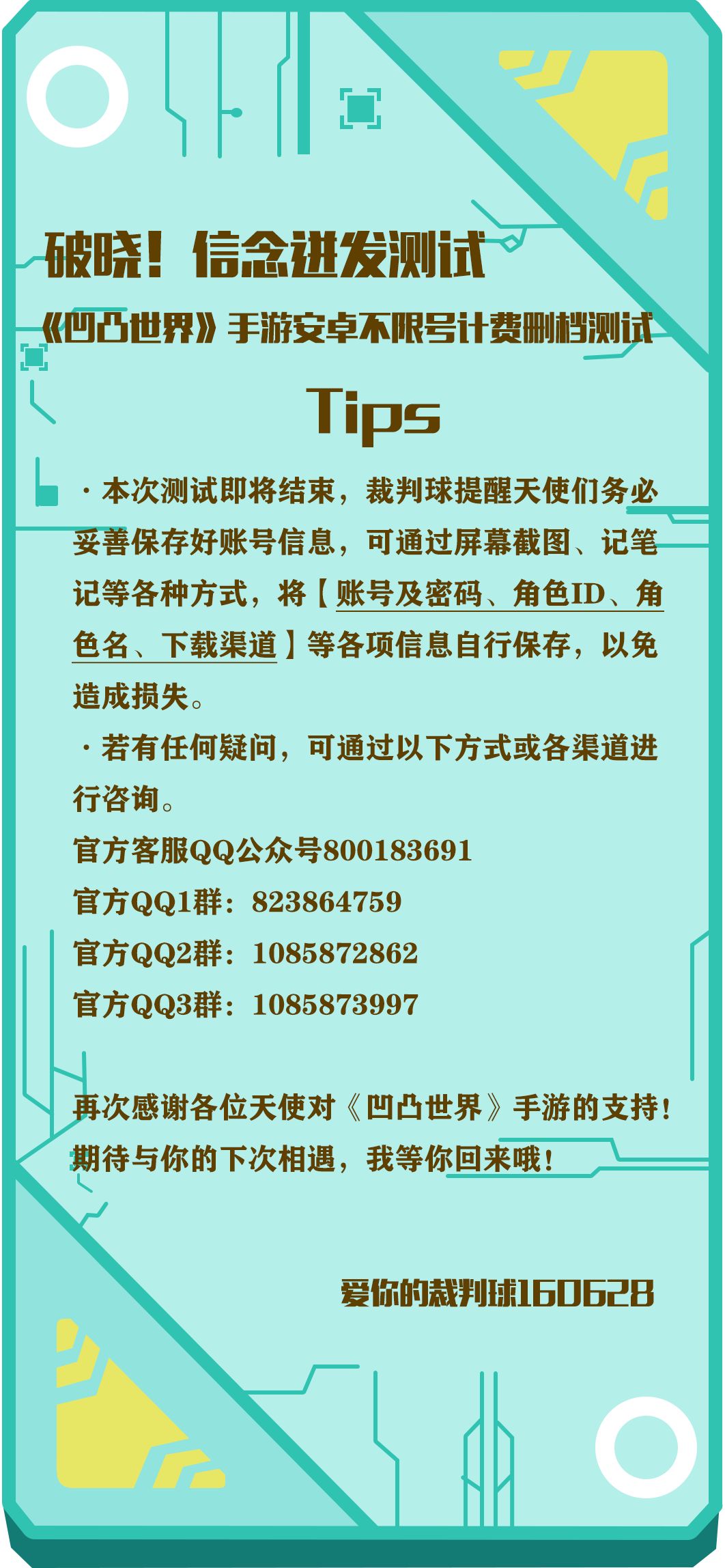 》手游“破晓!信念迸发测试”即将于2020年4月24日23:59关服,关于本次测试的最后一条碎碎念,大家一定要记得保留好账号信息啊!感谢天使们十天的陪伴,分别是为了更好的重聚,相信我,我们很快就会重逢~!