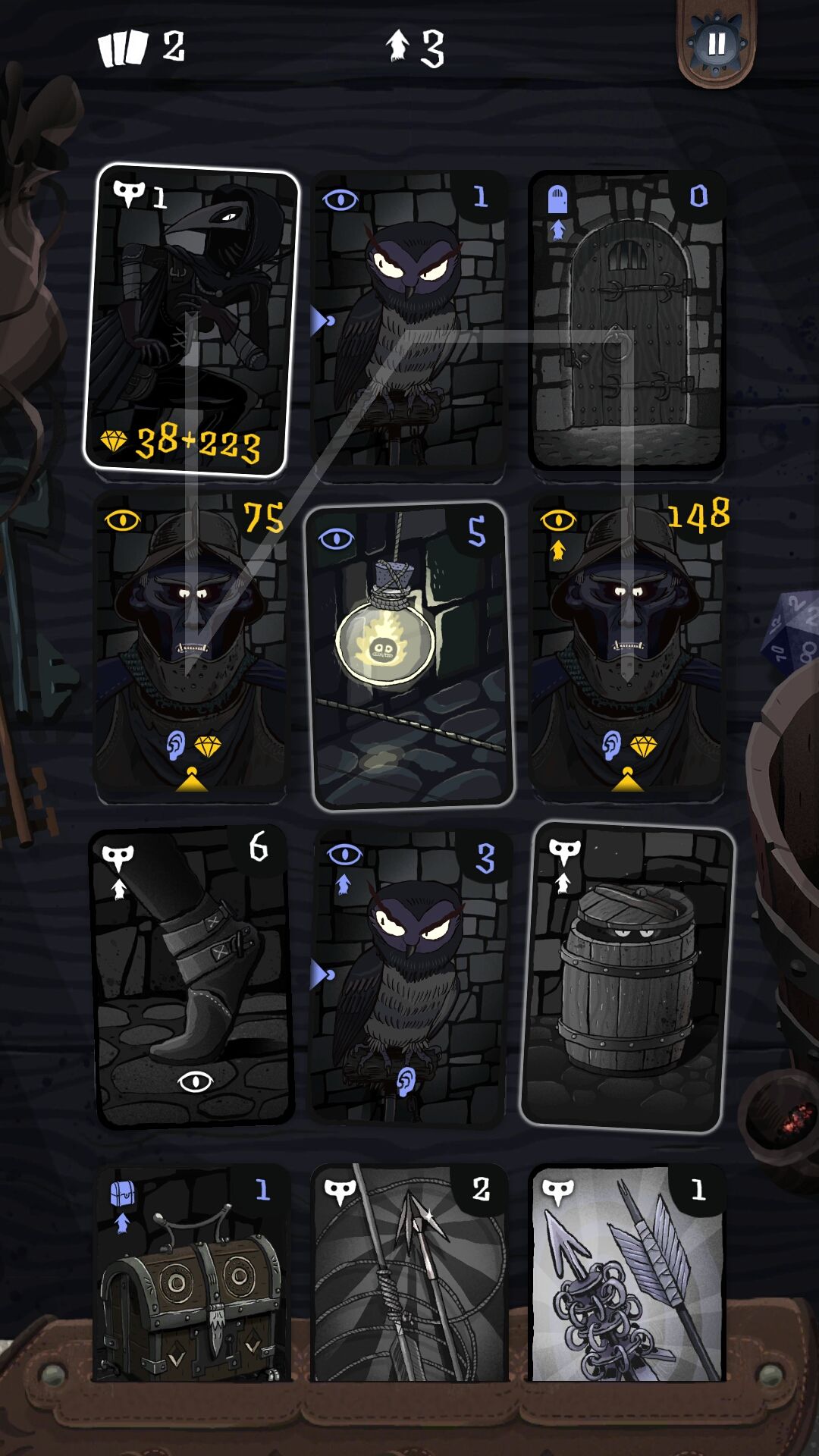 牌值的计算与路径系数:每张牌(木桶,出口除外)皆有其基础数值,初始随机为1或2(陷阱固定为5,宝箱在出现时为1),牌的最终牌值等于其基础数值乘以当前路径系数(陷阱,宝箱牌值不受路径系数影响)。路径系数显示在屏幕上方,在回合开始时,不在你角色周围的牌左上角会有一个上升箭头,每当你经过一张有上升箭头的牌,当前路径系数+1,路径系数在回合结束时重置为1。