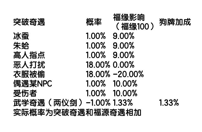这是以前官方po出来的突破奇遇几率,可以明显看到福缘100时,碰到传功和吃虫的几率是大大增加的