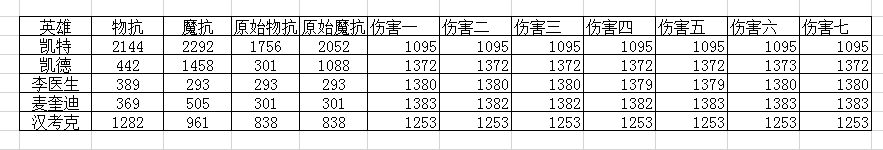 后来在面对boss的aoe伤害时发现一个有趣的现象,抗性相差悬殊的英雄,所受伤害相差不大,于是简单研究了一下。先上英雄属性截图,如下。