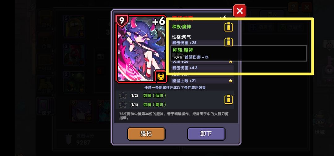 每张魂卡还有着不同的种族和性格,种族就是你要镶嵌多少个这个种族的魂卡才能出发种族效果,就像托拉托斯的魔神,只需要镶嵌她一张就能触发效果。