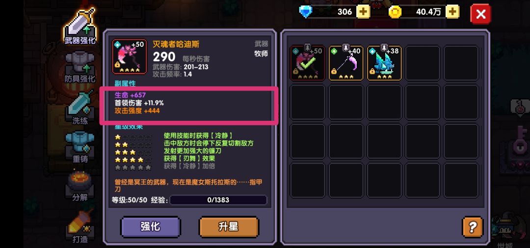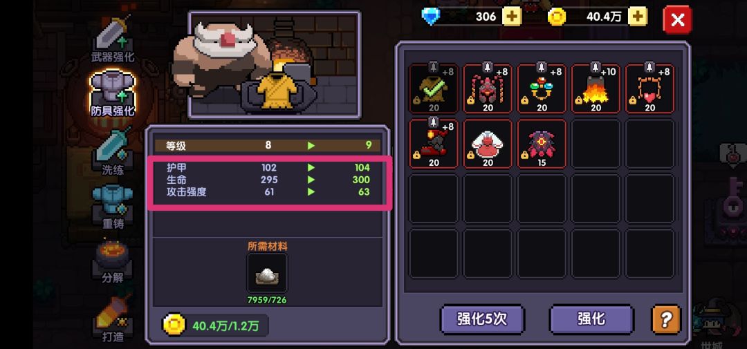 防具强化会加强基本属性,也不用怕装备更新换代亏钱亏材料,更换新装备后把老装备分解掉会返还所有金币和材料。