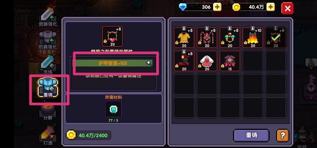 防具则是要在重铸界面进行,不同于武器洗练,防具只能重铸一条属性,一旦选择就无法更改,所以小伙伴们要三思而后行哦。