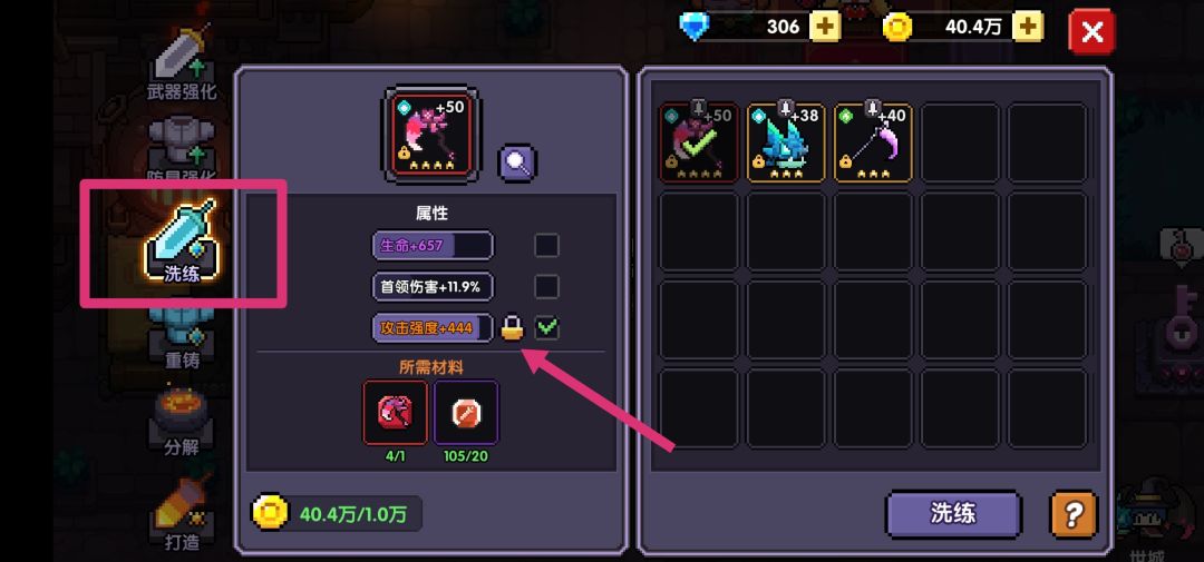 所以这时候我们就需要洗词条,进入铁匠铺,点击洗练界面。