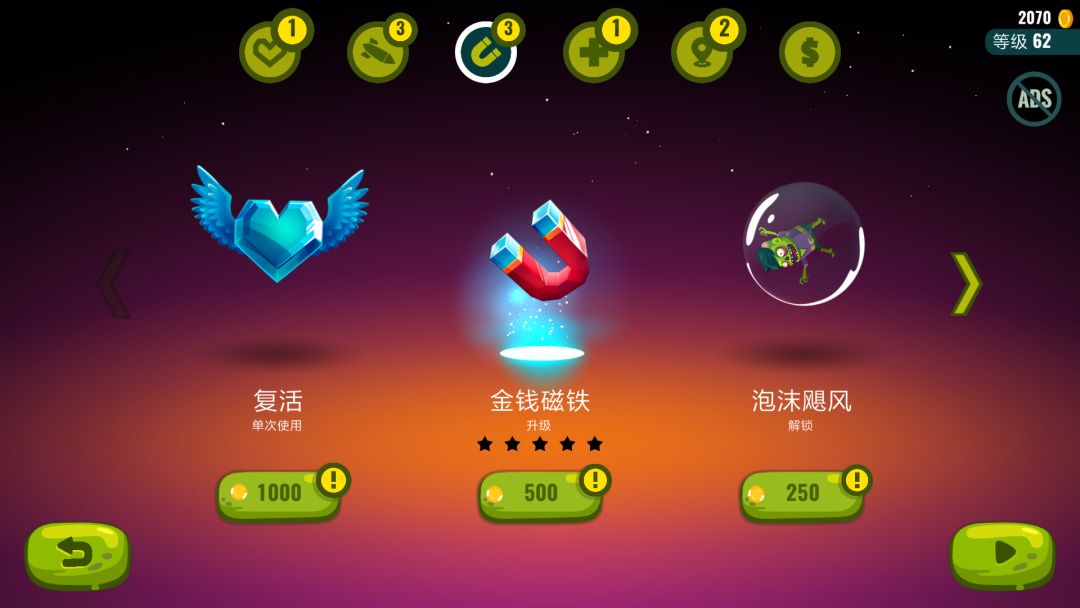 磁铁也相当鸡肋。。。因为吸过来的金币不算在完美跳跃里面,即使吸完一整条,也不会增加一颗星星。。。唯一好处就是,能吸过来道具。嗯没错,还可以吸能量币,攒速度条。