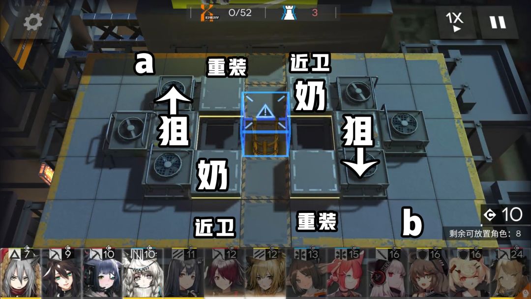 这关难度在人口上,一共四条路线,要保证每条路线一个战法牧明显是不可能的,所以最完美的解法是:两条路线狙击+重装,两条路线医疗+近卫,完美解决。