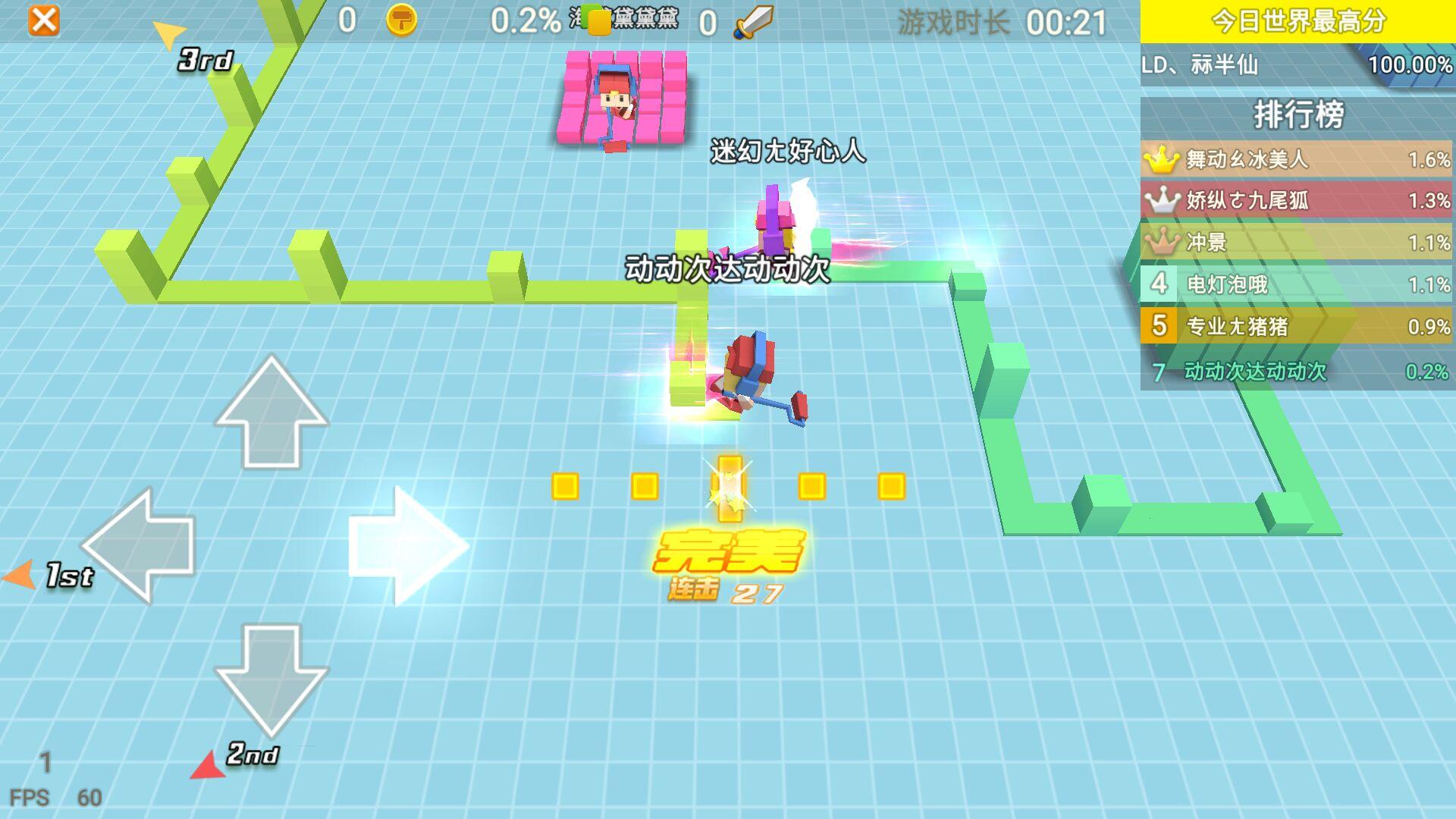 这是一款以踩节奏、圈地为游戏玩法的多人竞技游戏,游戏中你需要跟着音乐进行“打拍子”从而操纵你的人物快速粉刷地板!(如果卡不准节奏会减速很厉害)然后粉刷出的线和自己的领地接触就会让领地变得更大,对手接触你的线后你就会狗带,然后继续复活继续战斗。当然你还有各种技能可以选择,通过各种技能的合理使用来和对手过招,看最后谁的分数或是谁的领地最多(可多人组队)就是赢家!