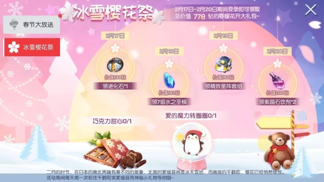 活动形式:2月13日更新后可点击游戏页面“节日”按钮查看,2月17日起累计登录游戏,可在活动页面领取总价值778钻的游戏奖励。