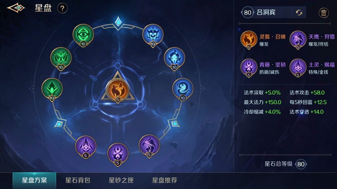 星盘建议,绿色攻击选择烈焰,防御选择渴血,通用选择凝神而不是智慧虽然吕洞宾会面临缺蓝的情况,但是只有出了深渊泉眼法力值消耗减少就不会缺蓝了,更不需要与打野抢蓝buff,蓝色分别是破魔、摄魂与潮汐。紫色星盘通用,可以带推荐的水灵·加护,但我很少拿buff就换成了土零·赐福开局可以先买木制法杖再买鞋,这样会比开局先买鞋子的对手高一点的,主星盘灵狐·召唤,和白莲·加护都可以选择,灵狐适合抓人与支援,白莲会加强开团的生存能力。个人建议新玩家是不会很快满星盘的,没用满之前绿色和蓝色就先不要升级通用星盘,主要升攻击很防御星盘。