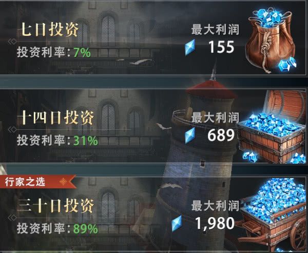 投资后可获得:投资后可获得即投资收益,根据投资模式、投资水晶数量的不同,系统会根据当前利率进行计算,并在投资后获得栏中显示出领主将会获得的投资收益。