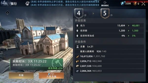银行升级:主堡达到17级解锁银行之后,主堡每提升1级,银行方可进行1次升级。当主堡等级达到25级时,银行最高可升级至9级。随着银行等级的提升,领主在银行中的投资额度上限和利率加成也会随之提升。