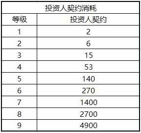 银行每次升级都需要消耗一定数量的资源(粮食、木材、矿石、铁矿)和投资人契约。等级越高,升级所需投资人契约数量越多,具体数据如下: